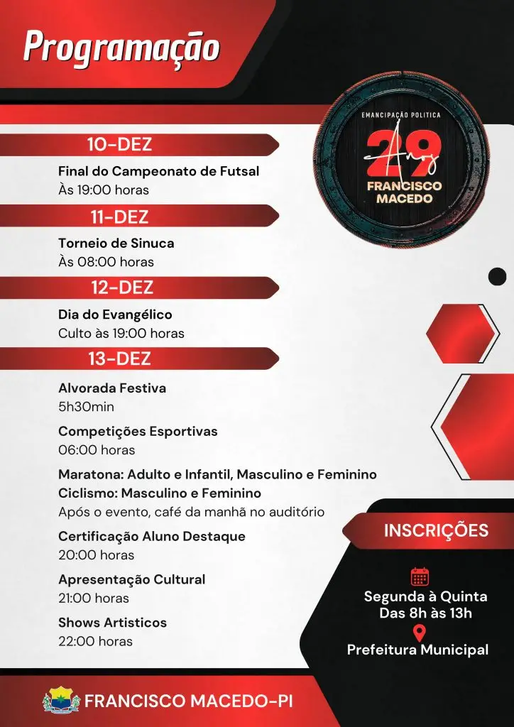 O município de Francisco Macedo, no Piauí, se prepara para celebrar seus 29 anos de emancipação política com uma programação especial organizada pela gestão do prefeito Adeilson Carvalho, conhecido popularmente como Novim.
