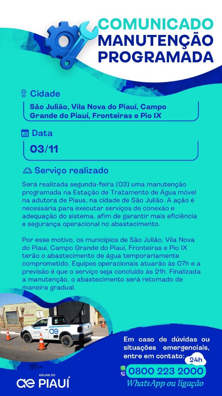A Águas do Piauí realiza hoje (03), uma parada programada no sistema de abastecimento de São Julião para a execução de serviços de interligação da Estação de Tratamento de Água (ETA) móvel à adutora Piaus. A ação faz parte das melhorias operacionais implementadas pela concessionária e tem como objetivo aumentar a eficiência e a segurança do sistema de abastecimento de água do município.