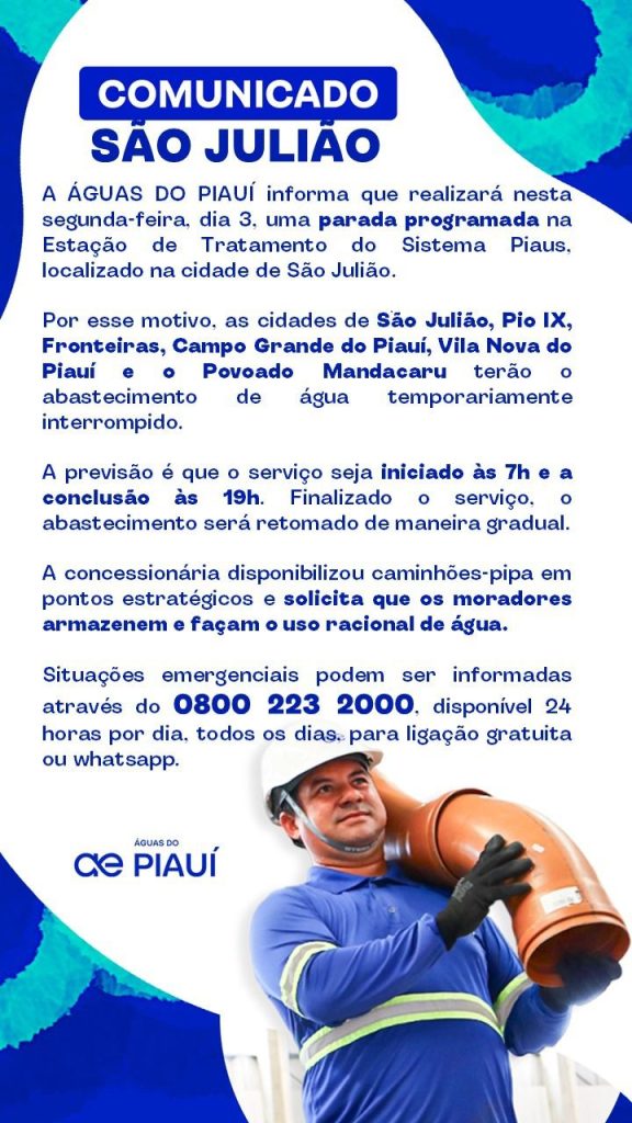 Durante a execução dos serviços, previsto para acontecer entre as 7h e às 21h, o fornecimento de água poderá apresentar interrupção em todo o município e em cidades da região, como Pio IX, Fronteiras, Campo Grande do Piauí, Vila Nova do Piauí e povoado Mandacaru. De forma emergencial, a concessionária colocará carros-pipa à disposição e assim que os trabalhos forem concluídos, o sistema será reativado e o abastecimento retornará de forma gradativa.