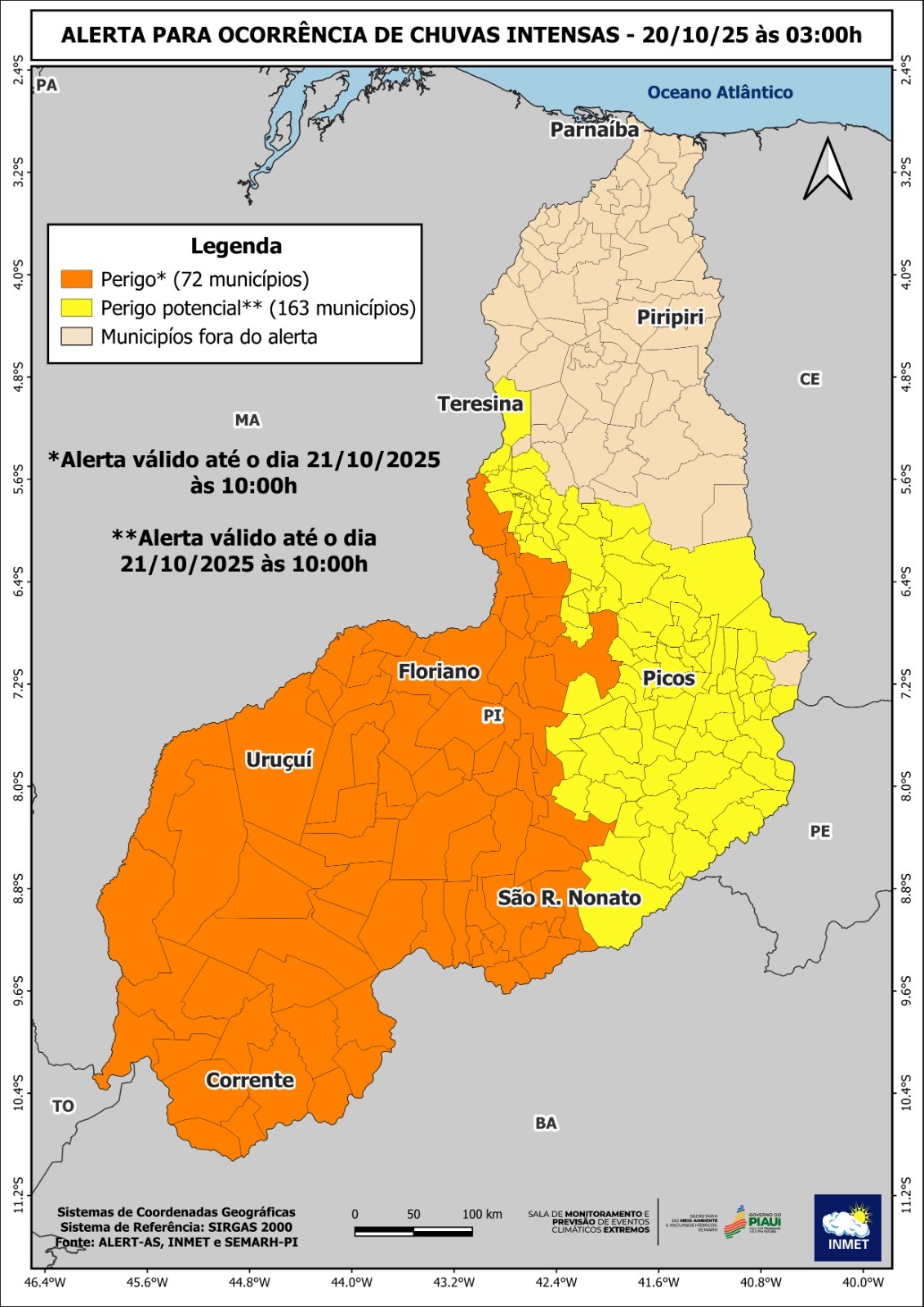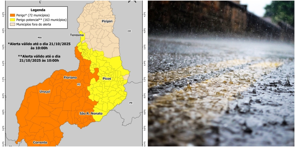 Entre os dias 20 e 21 de outubro, há chance de chuvas isoladas também no centro-norte, incluindo a região de Teresina, onde o alerta laranja do mapa indica áreas com possibilidade de precipitações mais intensas.
