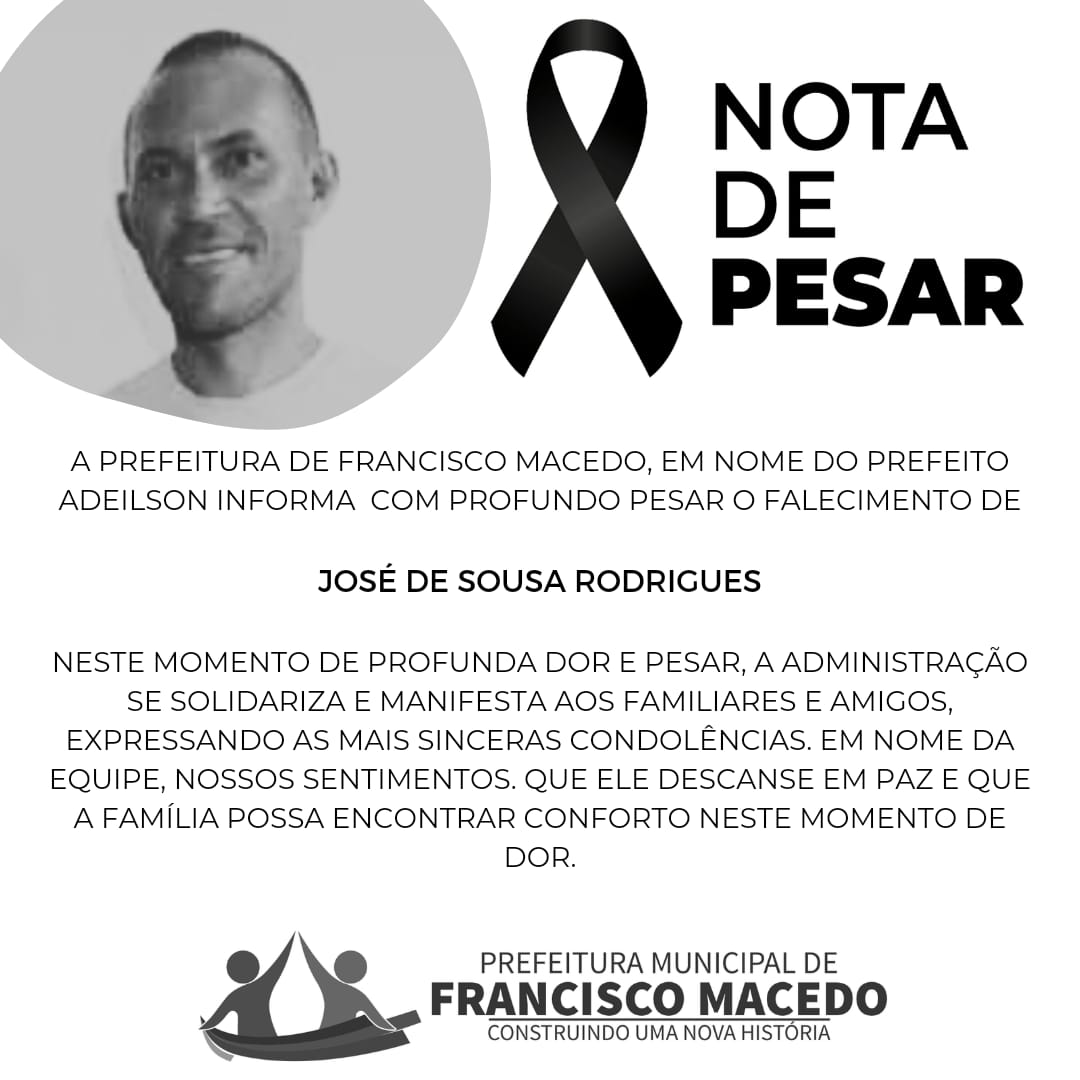 Em decorrência do falecimento de José de Sousa Rodrigues, a Prefeitura Municipal de Francisco Macedo, através do prefeito Novim, emitiu uma nota de pesar. No documento, a prefeitura expressou suas condolências à família e amigos, e destacou sua importância para a comunidade local.