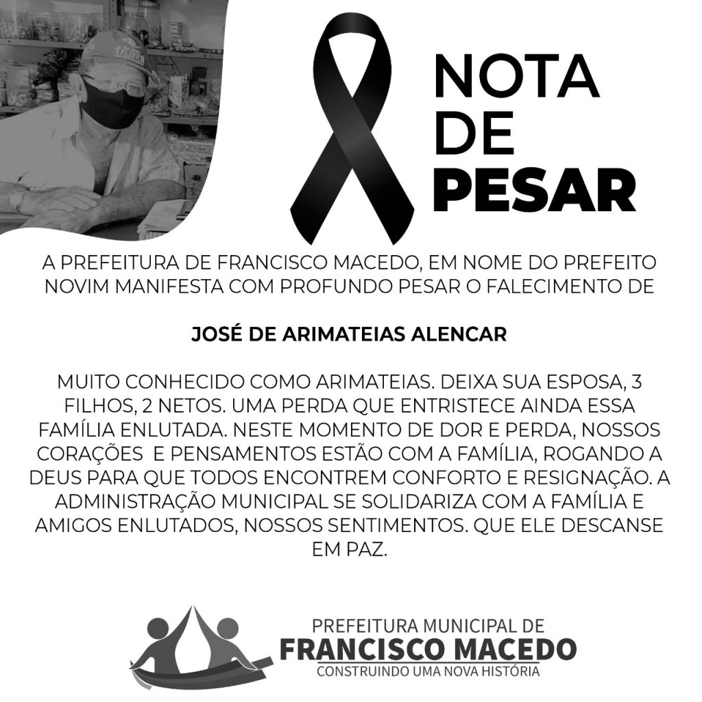 “A PREFEITURA DE FRANCISCO MACEDO, EM NOME DO PREFEITO NOVIM MANIFESTA COM PROFUNDO PESAR O FALECIMENTO DE JOSÉ DE ARIMATEIAS ALENCAR, MUITO CONHECIDO COMO ARIMATEIAS.