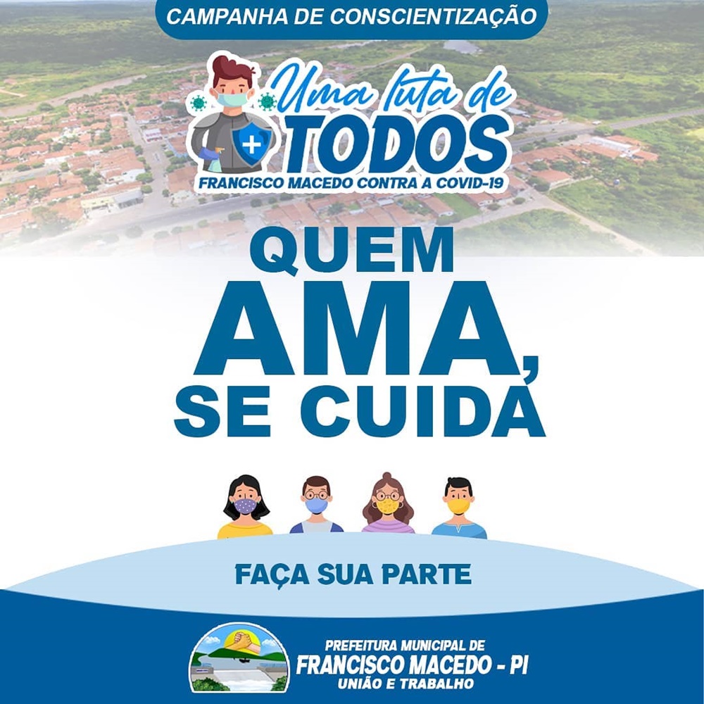 A pandemia do novo coronavírus estancou o fluxo cotidiano em todo mundo levando as pessoas a uma parada obrigatória, para evitar a intensificação e disseminação da doença. Como forma de prevenção e sensibilização a Prefeitura de Francisco Macedo lançou nesta quarta-feira, 12 de agosto, a campanha “Quem ama se cuida” que traz como lema “Uma luta de todos”.