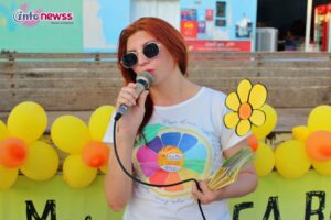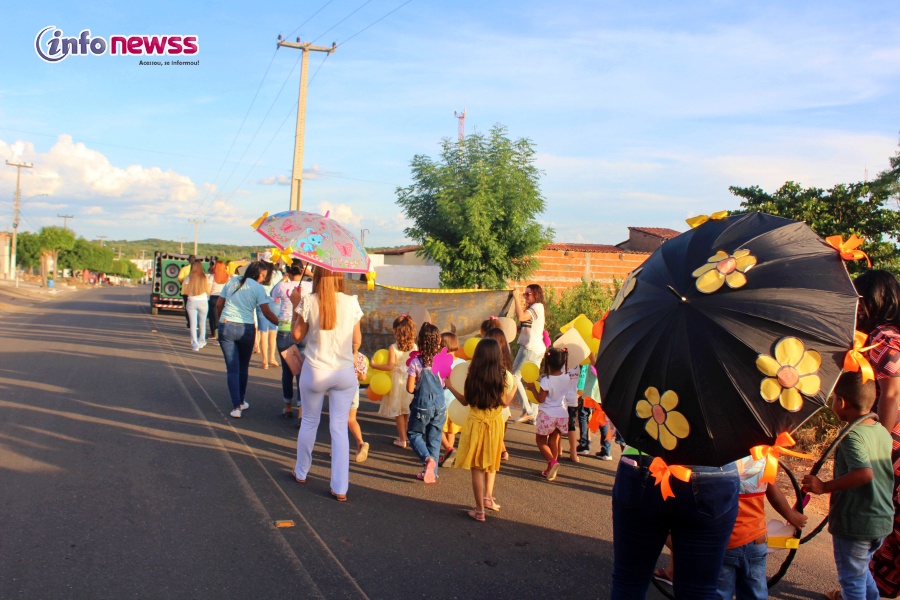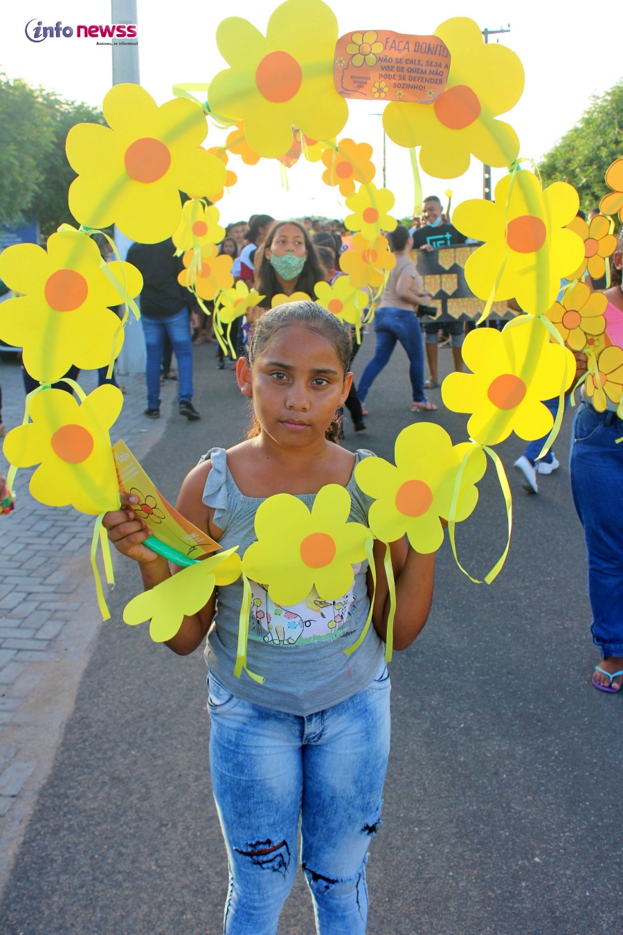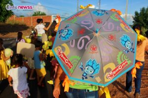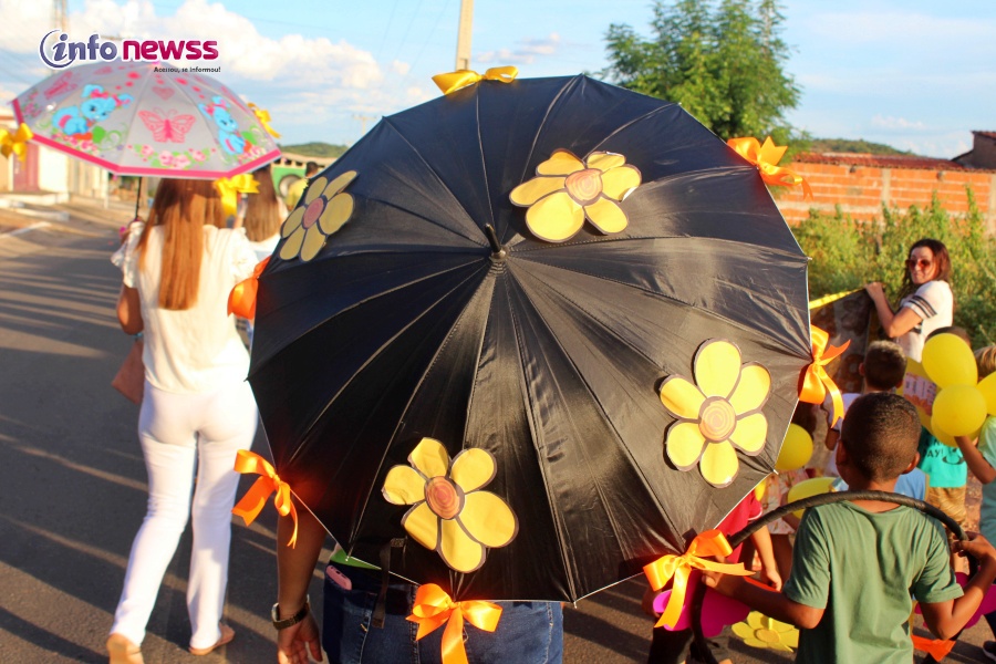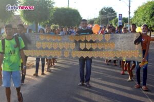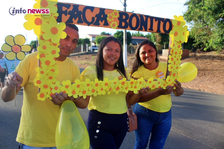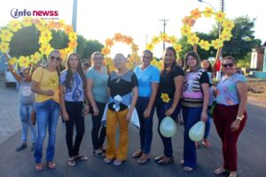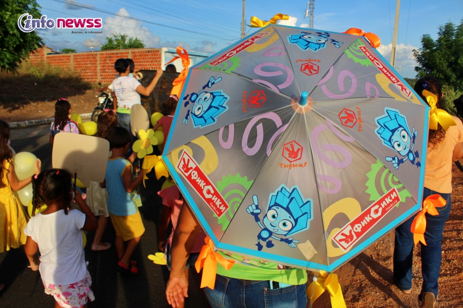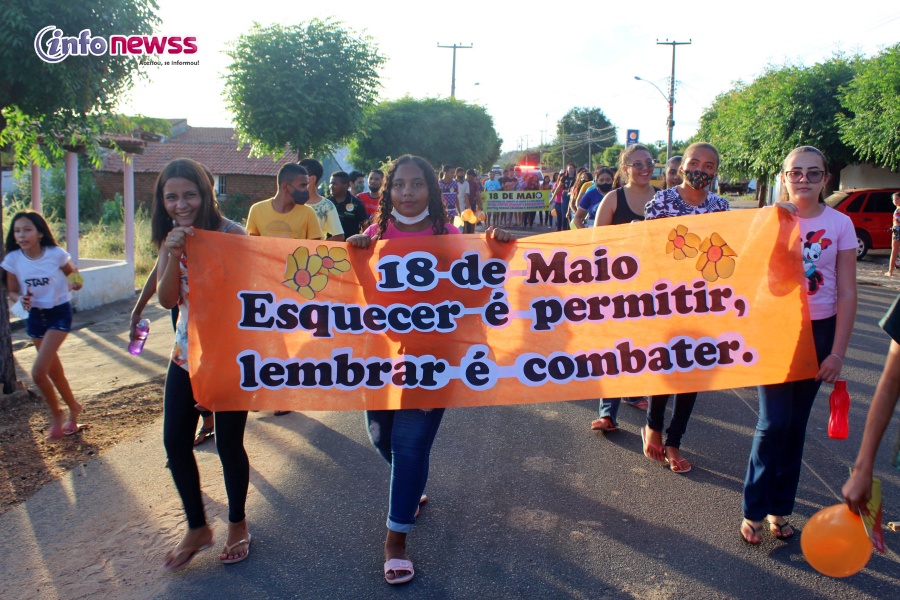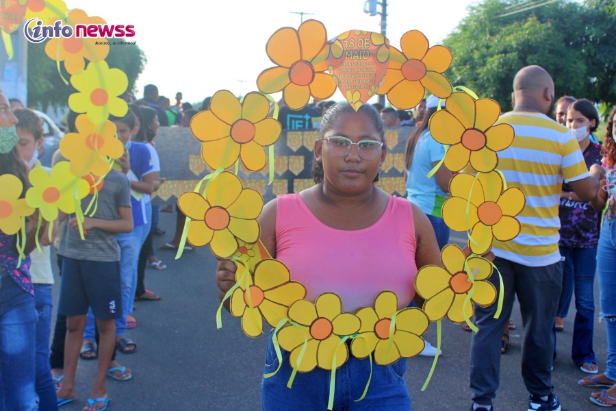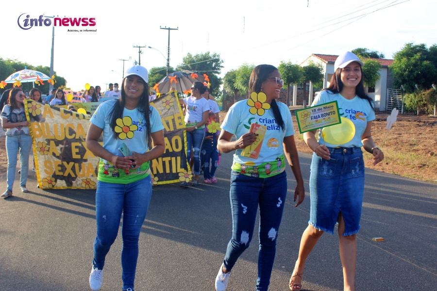 Portando balões, a flor símbolo da campanha, cartazes e vestidas de amarelo e laranja, cores do 18 de maio, e distribuindo panfletos, os participantes saíram em caminhada pelas ruas da cidade, alertando para a importância e necessidade do enfrentamento à violência sexual praticada contra o público infantojuvenil.