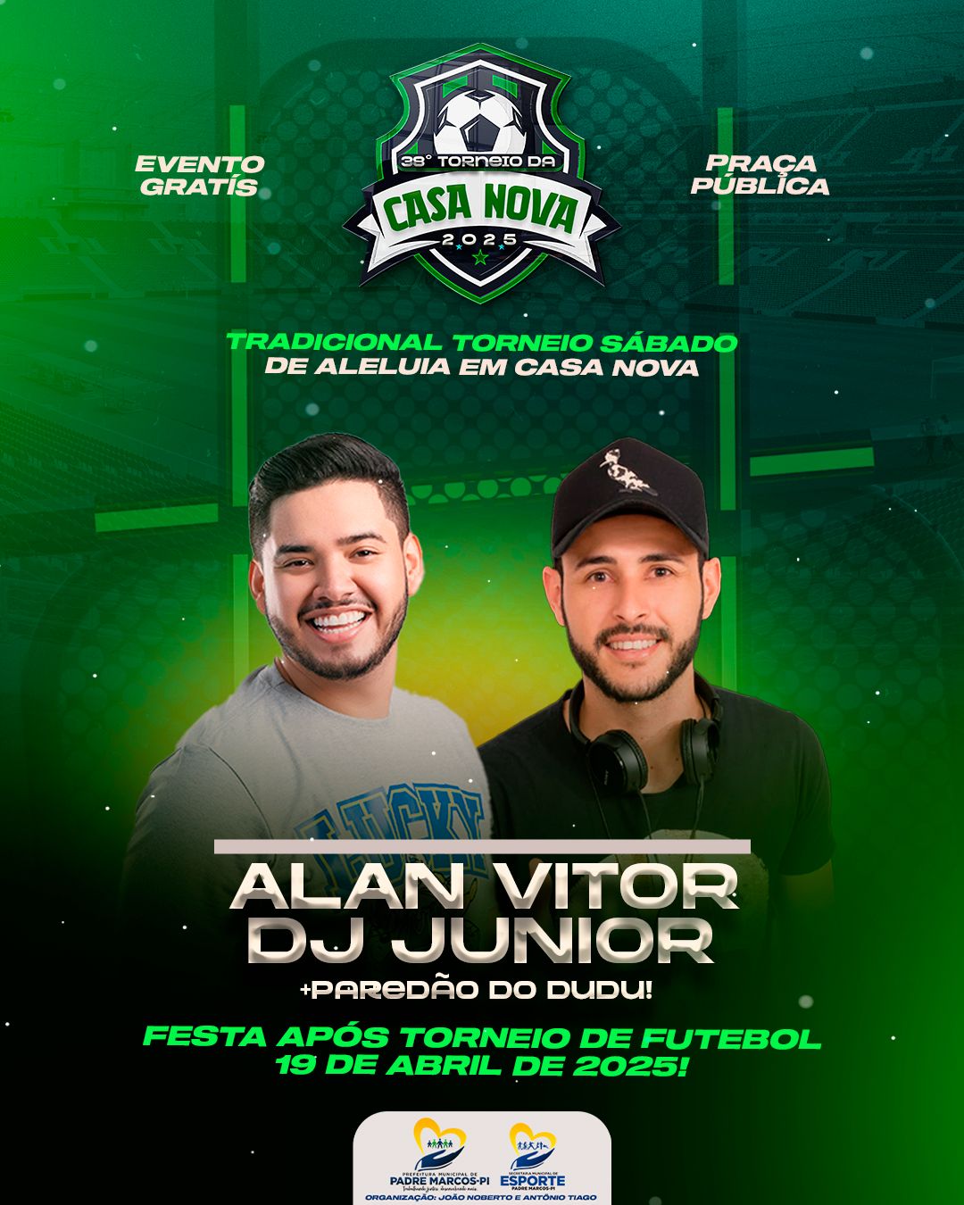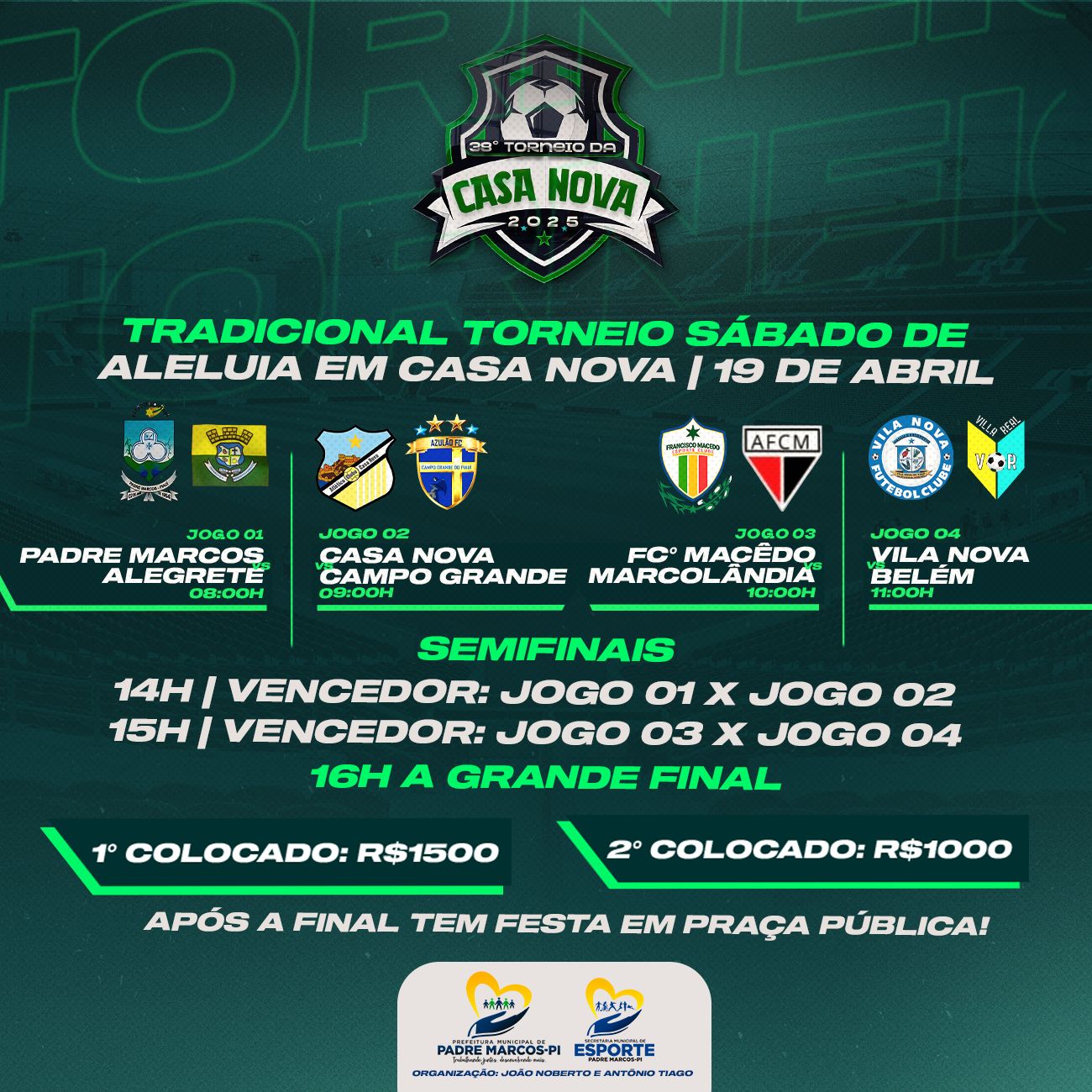 A Prefeitura de Padre Marcos, por meio da Secretaria Municipal de Esportes, anunciou nesta terça-feira (01) a programação oficial da 38ª edição do tradicional Torneio de Sábado de Aleluia, que será realizado no povoado Casa Nova, localizado no município. Considerado um dos principais eventos esportivos da região, o torneio é uma celebração da Semana Santa que promete atrair a atenção de moradores e visitantes, promovendo tanto o esporte quanto as tradições culturais da cidade.