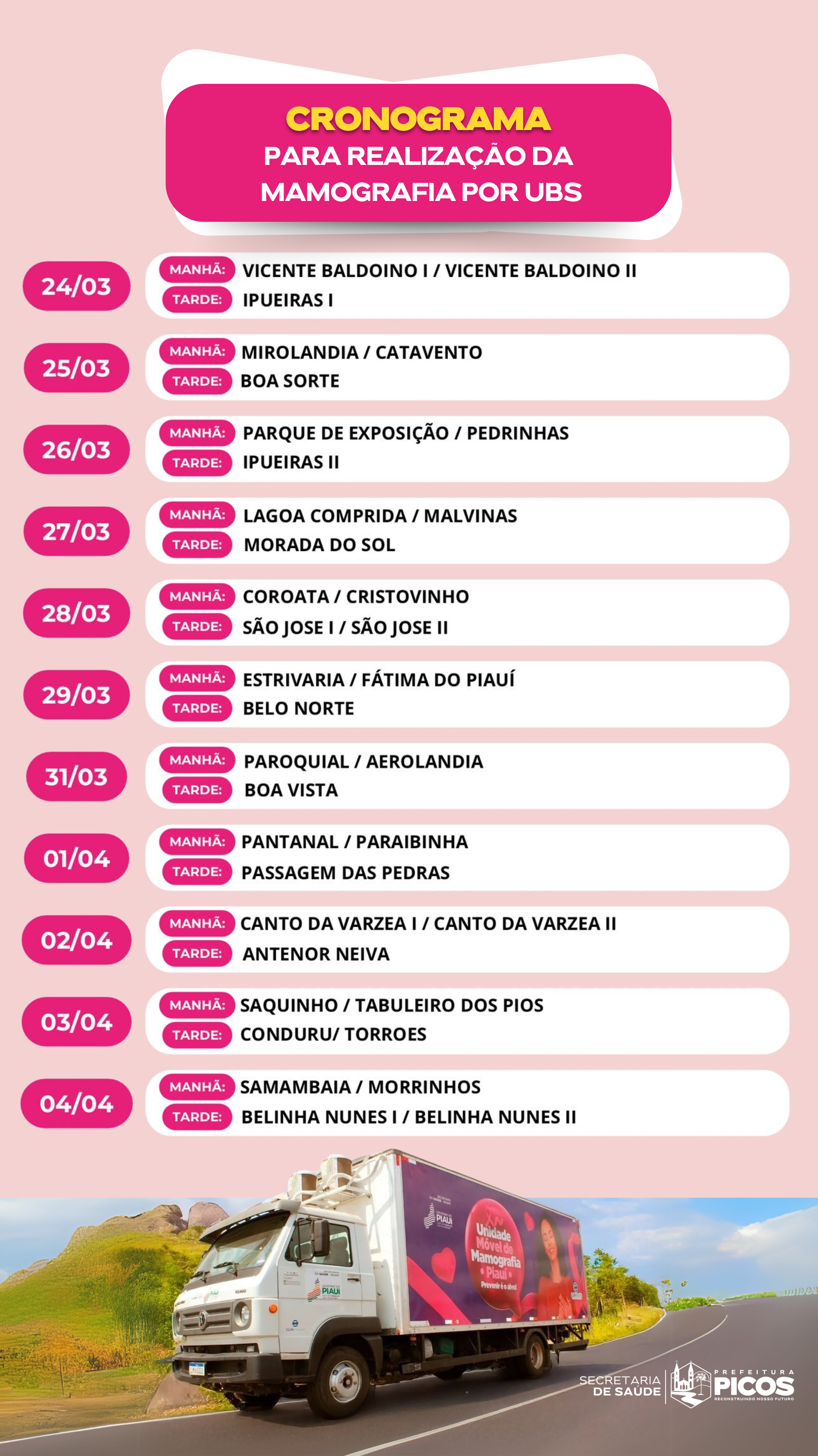 A Secretaria Municipal de Saúde de Picos anunciou o cronograma de atendimento do Caminhão da Mamografia, que oferecerá exames gratuitos à população. A unidade móvel estará posicionada ao lado do PAIM, entre os dias 24 de março e 4 de abril, atendendo conforme as marcações feitas previamente nas Unidades Básicas de Saúde (UBS).