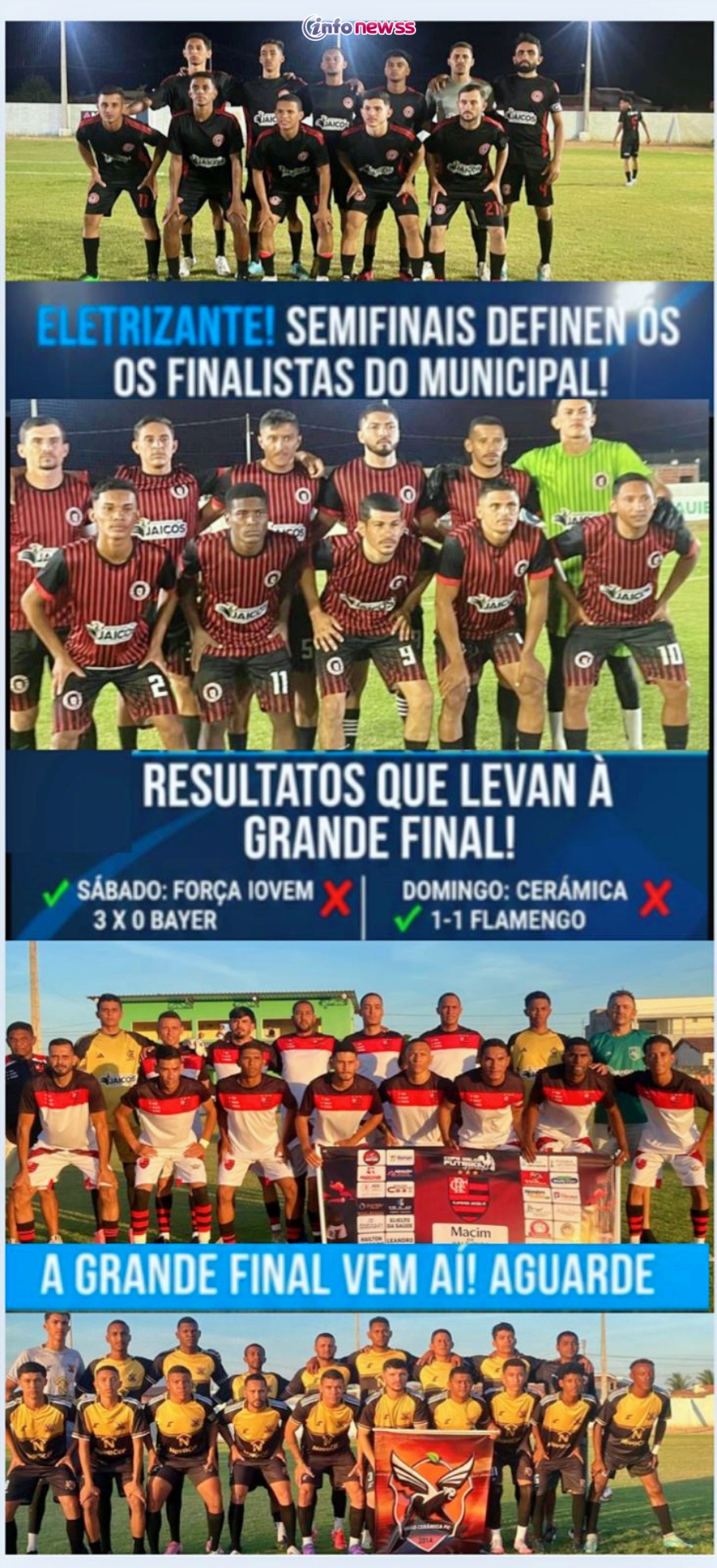 Com os resultados, Força Jovem e Cerâmica se enfrentam na grande final do Campeonato Municipal de Jaicós, prevista para acontecer no dia 1 de novembro, a disputa do terceiro lugar acontece na sexta-feira dia 31 de outubro.